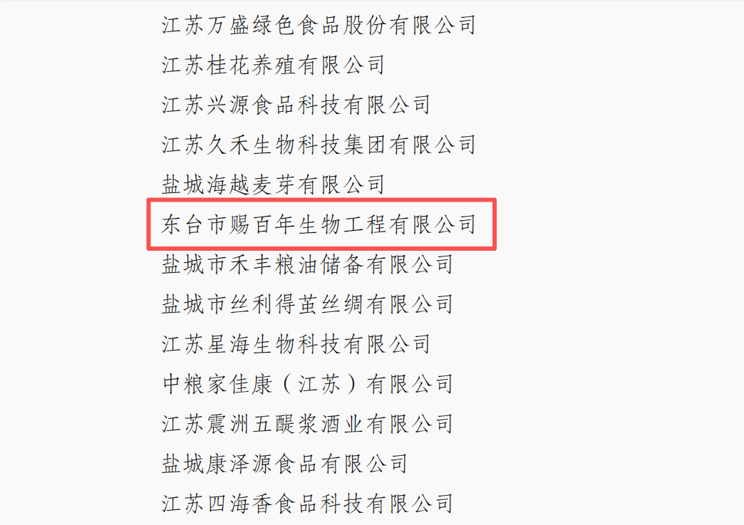近日,江苏省农业农村厅发布《关于公布2025年农业产业化省重点龙头企业监测合格和递补企业名单的通知》(苏农产〔2025〕5号),东台市赐百年生物工程有限公司成功通过监测,保留农业产业化省重点龙头企业资格。